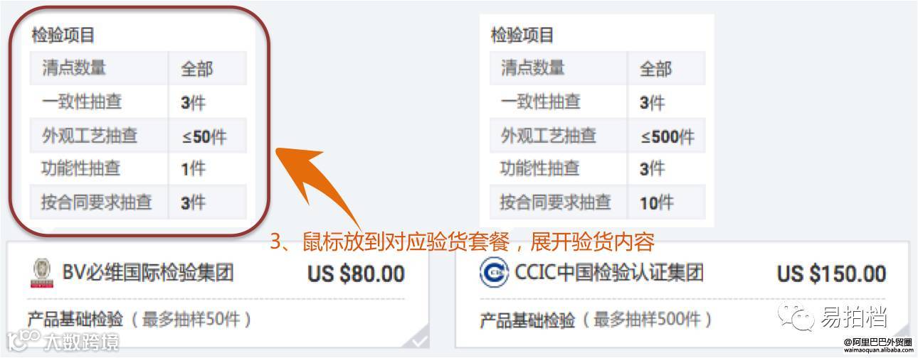 Ø点击勾选发货前验货服务——勾选后展开验货套餐——鼠标放到对应验货套餐展开验货内容;