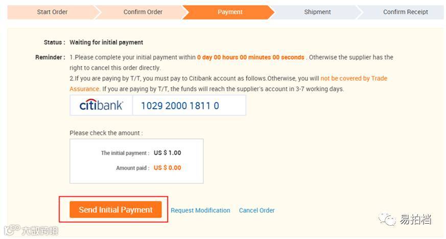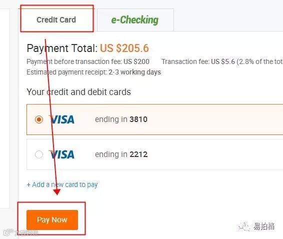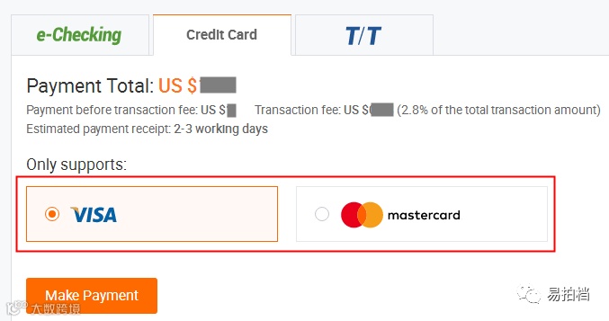 For other kind of Trade Assurance order, click ”Send Initial Payment“ or "Pay The Balance". and choose "Credit Card" - "Visa" or "MasterCard". 2.8 % of the whole order amount will be charged.