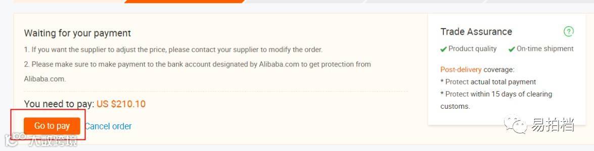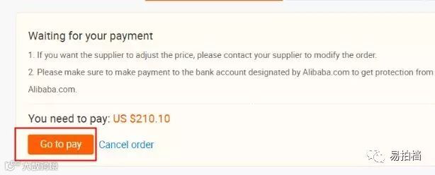 For the Trade Assurance order placed by "buy now" button, click "Go to pay". No processing fees will be charged by Alibaba.com.