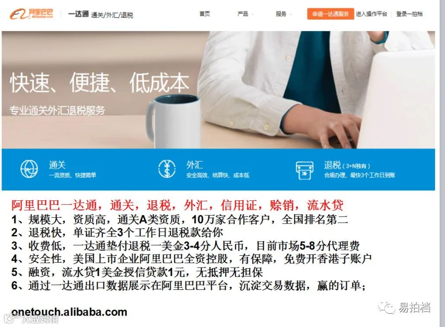 阿里巴巴一达通(onetouch)是中国外贸服务创新模式的代表,也是全中国服务企业最多,地域最广的外贸综合服务平台。