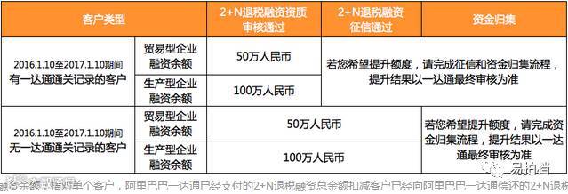 2、对2016年1月10日至2017年1月10日期间在阿里巴巴一达通无通关记录的客户,在完成2+N退税融资资质审核和征信流程后,阿里巴巴一达通将为客户开放50万人民币(贸易型)/100万人民币(生产型)的融资额度;若客户希望提升额度,则需配合完成资金归集。