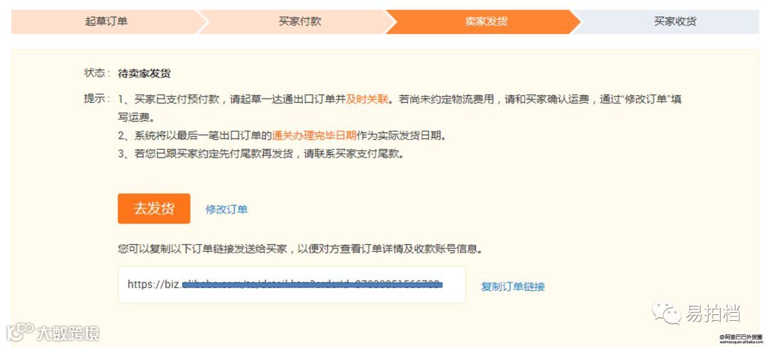 买家登录订单详情页点击“Confirm”进行确认收货后(卖家可直接复制订单详情链接给买家),且全款已收齐时交易完结;