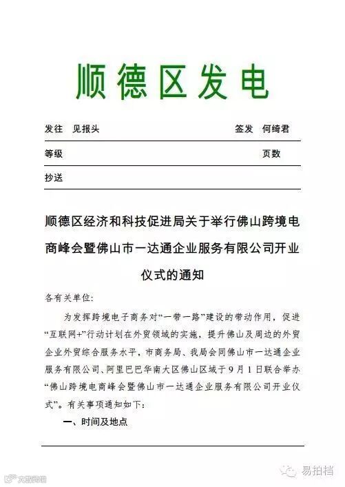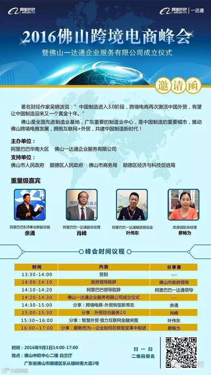 佛山一达通8月8日注册成立,分公司的成立后更方便我们当地的企业还原出口数据以利于享受未来的数据红利,为此我们将于2016年9月1号举行佛山一达通成立庆典仪式,届时佛山市政府、佛山市经贸局、阿里巴巴集团国际部副总裁都将出席,会场除了公布一达通流水贷款、金融赊销、信用证融资买断、中信保订单贷款政策,还有更多新资讯新方向邀请您到现场过来听听。