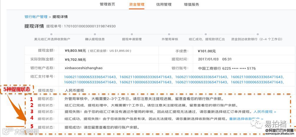 卖家选择已提现订单查看提现详情,提现状态会存在5种情况,请跟着提示操作;