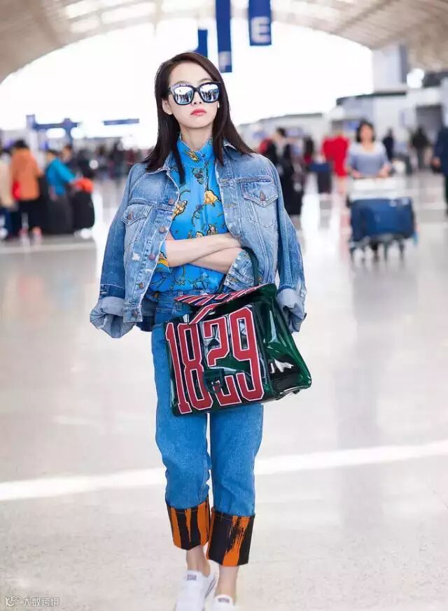 內搭花襯衫,外披牛仔外套,個性數字手袋,宋茜這套搭配不能再亮眼。