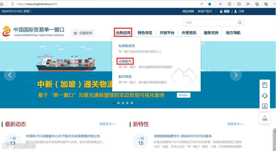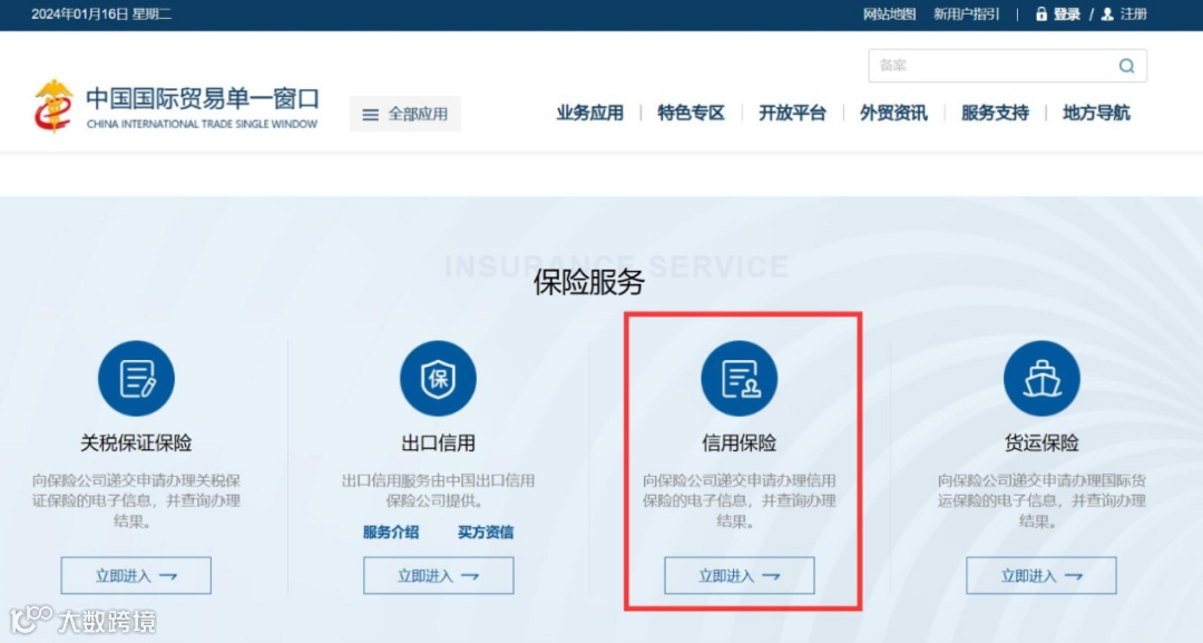 第1步:登录中国国际贸易单一窗口,在首页找到“业务应用”栏目,点击“金融服务”,页面下拉至最底部找到“保险服务”,点击“立即进入”