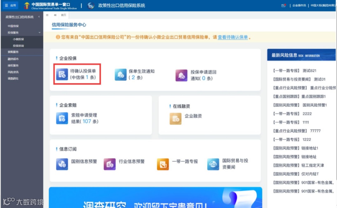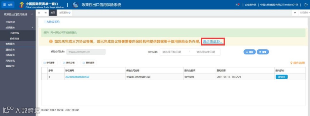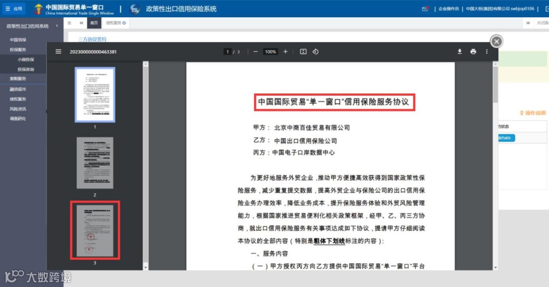 第4步(针对2024年前未投保过的小微企业客户,投保过的忽略此步):投保前需签署信保、电子口岸数据中心和投保企业的三方协议,按页面操作提示完成三方协议的签署,实现数据授权。