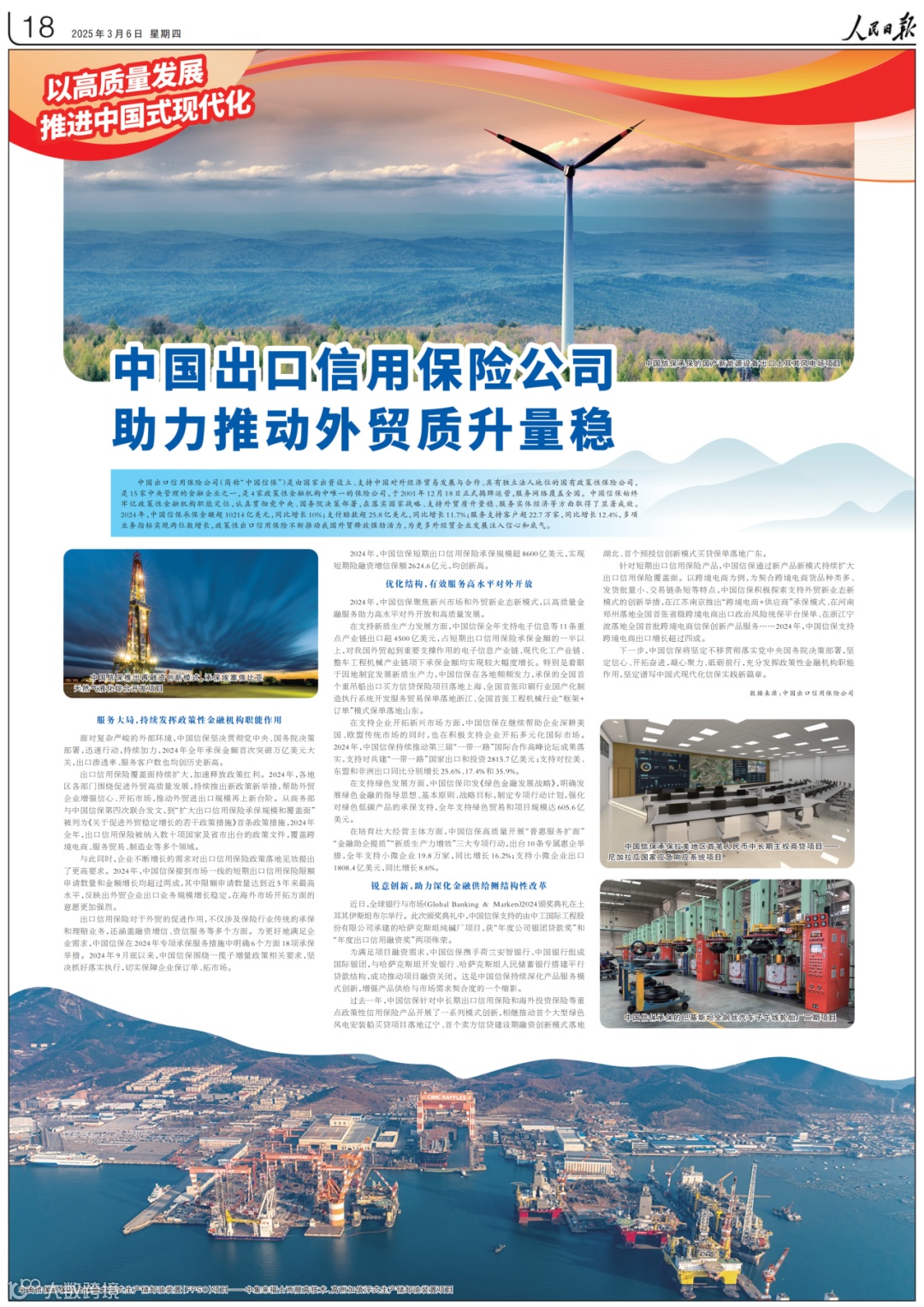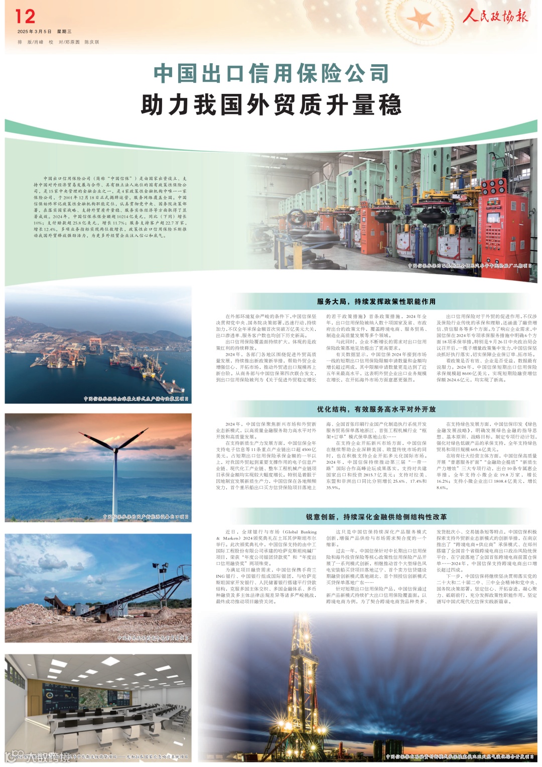 2025年全国两会召开之际,《人民日报》和《人民政协报》分别于3月6日、5日整版刊发了《中国出口信用保险公司助力推动外贸质升量稳》,报道了中国信保在落实国家战略、支持外贸质升量稳、服务实体经济等方面取得的显著成效。