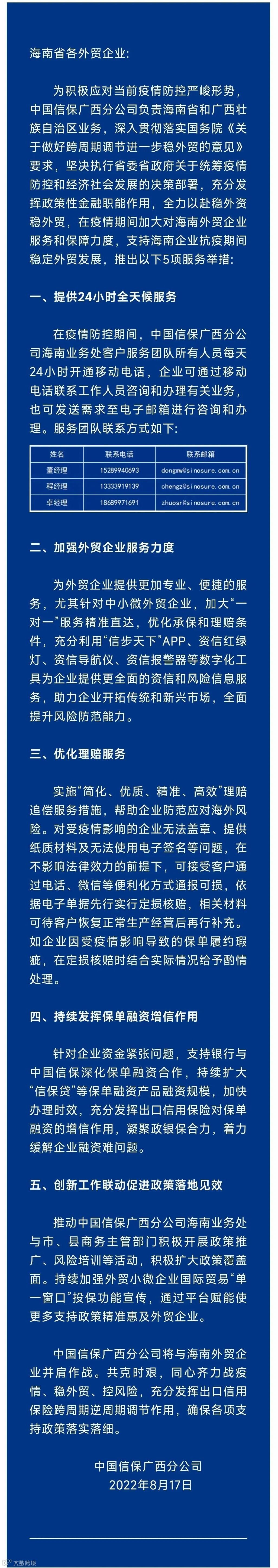 导读:为积极应对当前疫情防控严峻形式,中国信保广西分公司负责海南省和广西壮族自治区业务,深入贯彻落实国务院《关于做好跨周期调节进一步稳外贸的意见》要求,坚决执行省委省政府关于统筹疫情防控和经济社会发展的决策