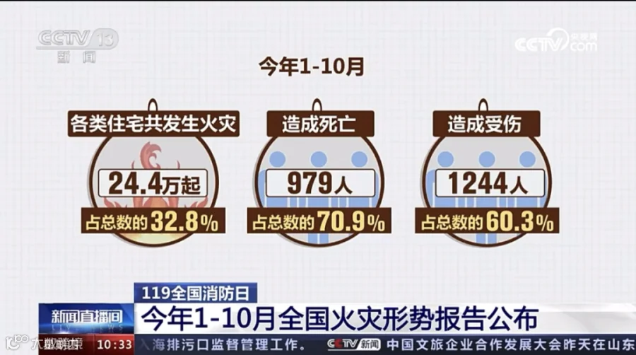 今年1至10月,全国共接报火灾74.5万起,死亡1381人,受伤2063人,已核直接财产损失61.5亿元,与去年同期相比,起数和伤人数分别上升2.5%和6.5%,亡人数和损失分别下降13.2%和9.7%。