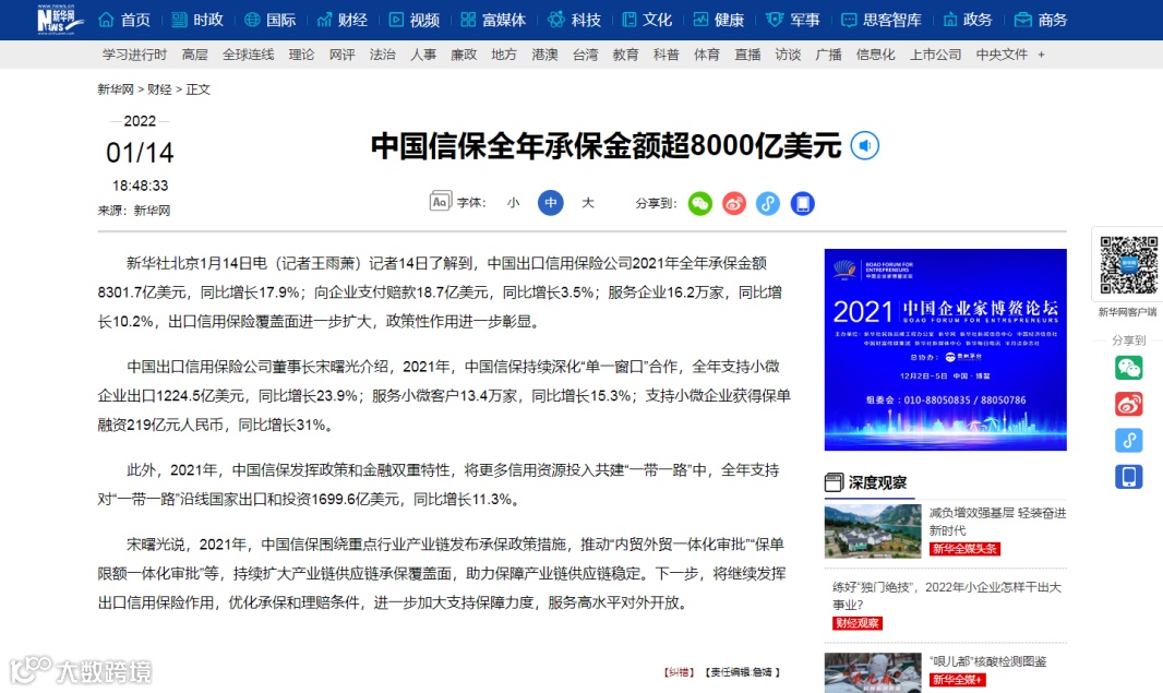 记者了解到,中国信保2021年全年承保金额8301.7亿美元,同比(下同)增长17.9%;向企业支付赔款18.7亿美元,增长3.5%;服务企业16.2万家,增长10.2%,出口信用保险覆盖面进一步扩大,政策性作用进一步彰显。
