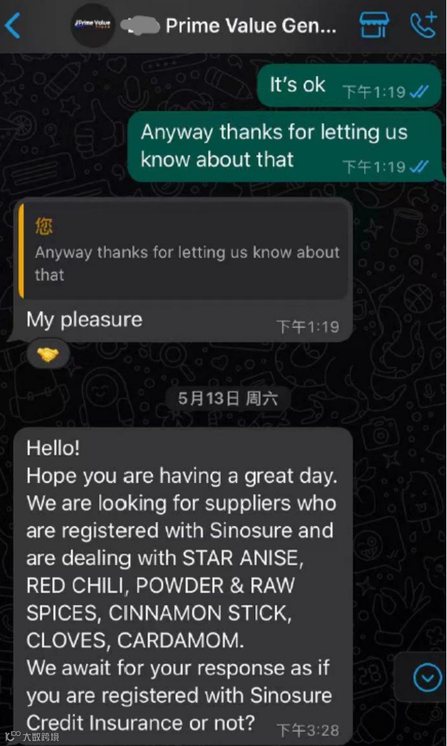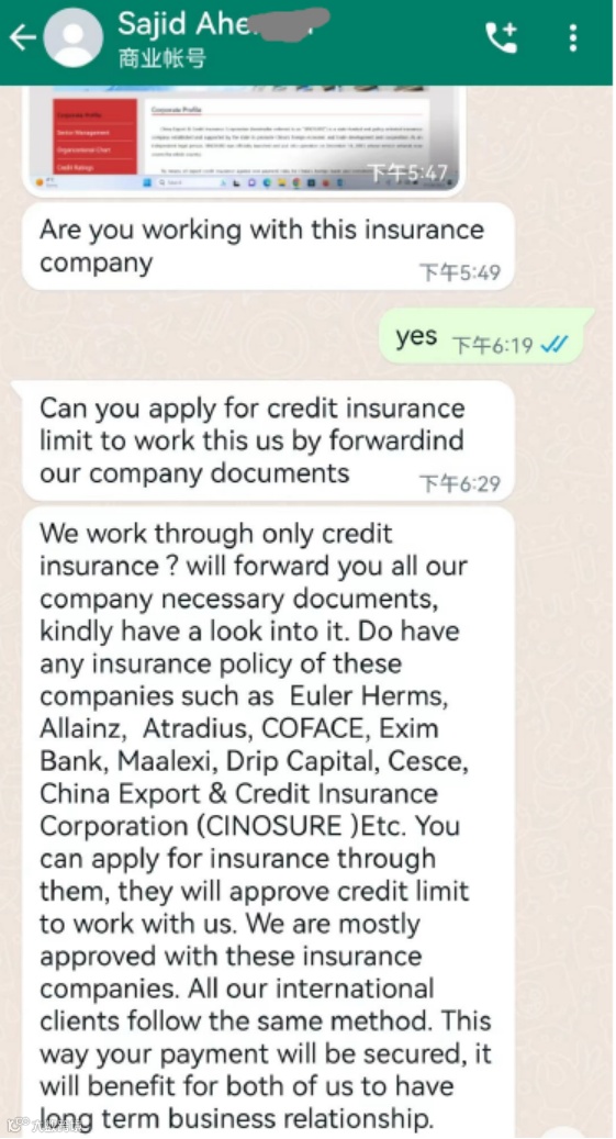 外贸企业朋友们,如您收到类似这样的一上来就点名“Sinosure”的,请务必留个心眼,仔细甄别,避免上当受骗!下面,给大家介绍一宗贸易欺诈的案例。