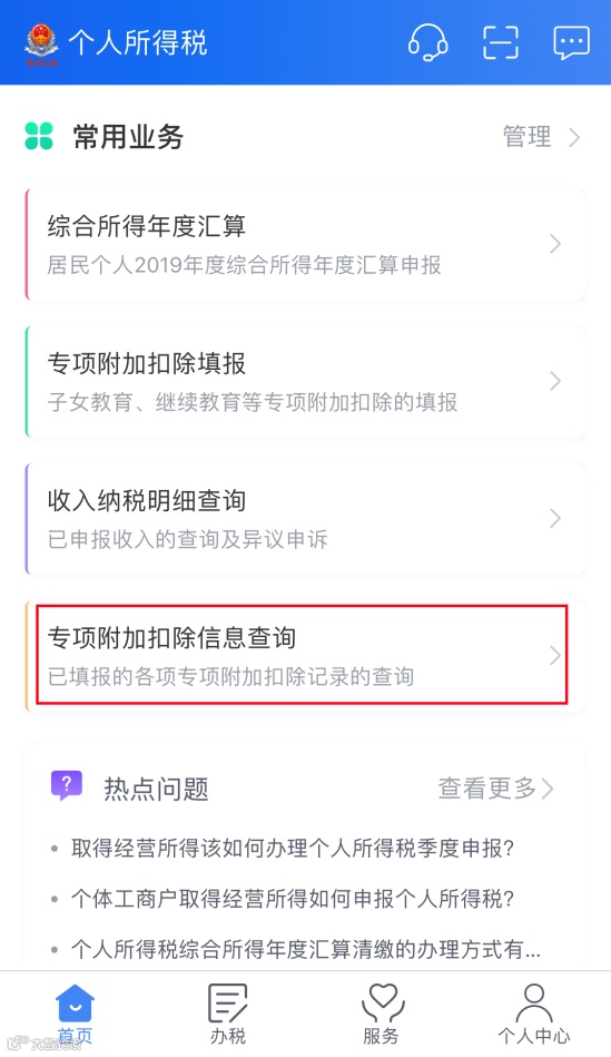 在首页依次点击【常用业务】-【专项附加扣除信息查询】,选择“2020年度”,可查看您已填报的专项附加扣除信息。