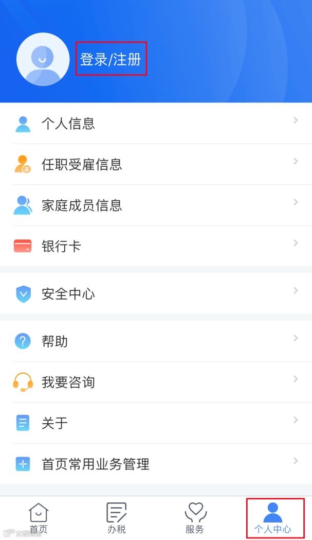 打开个人所得税后显示首页页面,点击【个人中心】-【登录/注册】,可自行注册并登录。