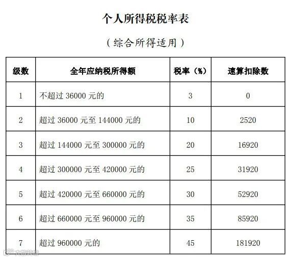 依据税法规定,2020年度终了后,居民个人(以下称“纳税人”)需要汇总2020年1月1日至12月31日取得的工资薪金、劳务报酬、稿酬、特许权使用费等四项所得(以下称“综合所得”)的收入额,减除费用6万元以及专项扣除、专项附加扣除、依法确定的其他扣除和符合条件的公益慈善事业捐赠(以下简称“捐赠”)后,适用综合所得个人所得税税率并减去速算扣除数(税率表如下),计算本年度最终应纳税额,再减去2020年度已预缴税额,得出应退或应补税额,向税务机关申报并办理退税或补税。