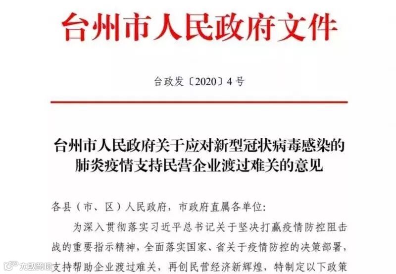 2020年2月5日,台州市正式出台《台州市人民政府关于应对新型冠状病毒感染的肺炎疫情支持民营企业渡过难关的意见》支持和帮助企业渡过难关: