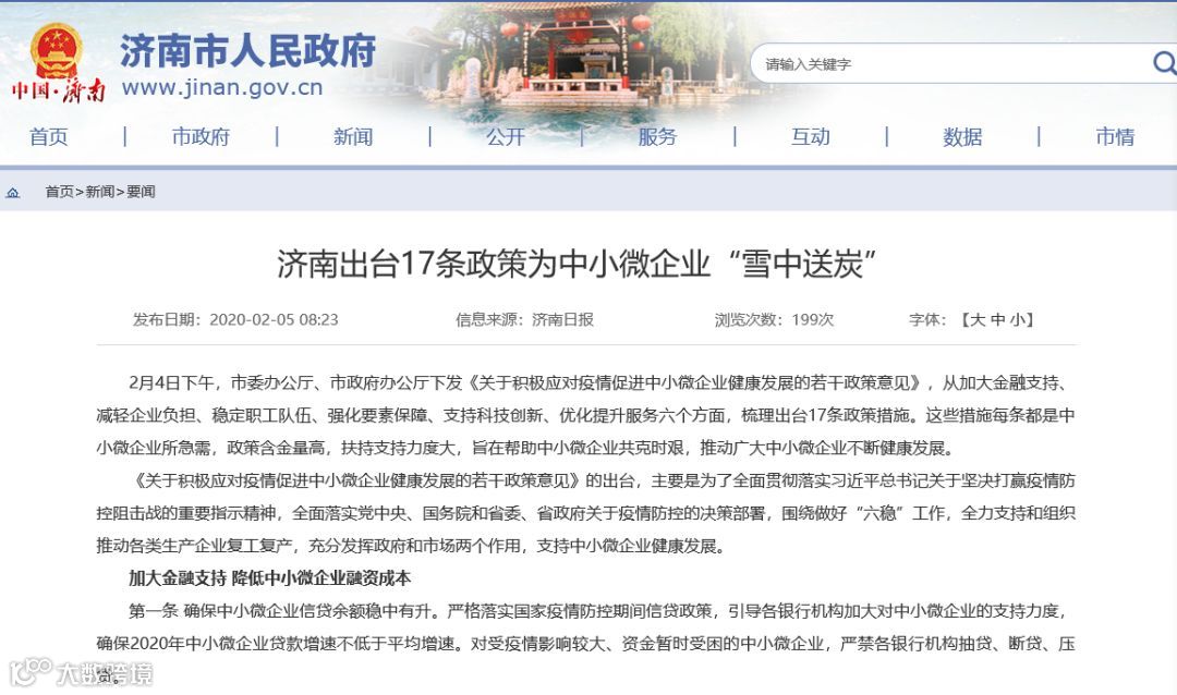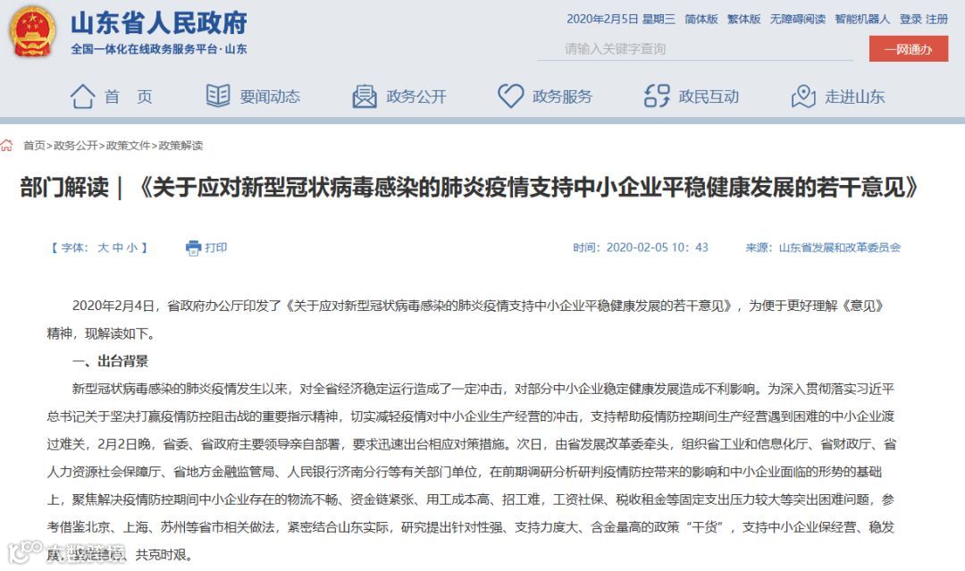 2020年2月3日晚,青岛市政府办公厅出台《关于应对新型冠状病毒感染的肺炎疫情支持中小企业保经营稳发展若干政策措施的通知》: