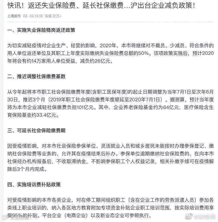 2020年2月3日,上海市疫情防控工作领导小组指挥部新闻发布会上,上海市人社局会同市医保局、市财政局等相关部门共同推出减负的一系列政策: