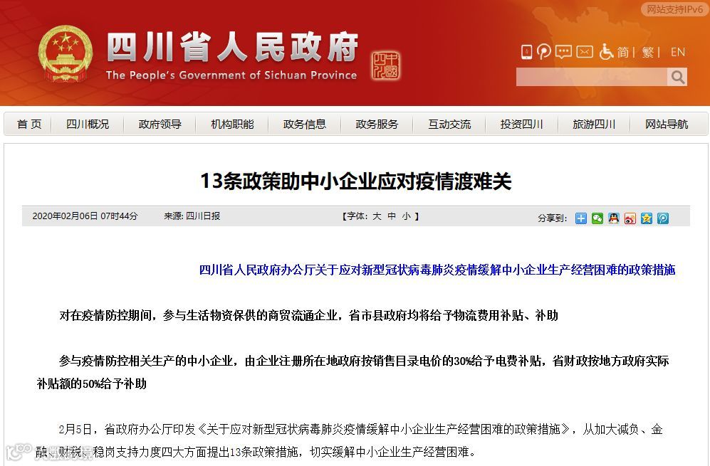 2020年2月5日,四川省省政府办公厅印发《关于应对新型冠状病毒肺炎疫情缓解中小企业生产经营困难的政策措施》,从加大减负、金融、财税、稳岗支持力度四大方面提出13条政策措施,切实缓解中小企业生产经营困难:
