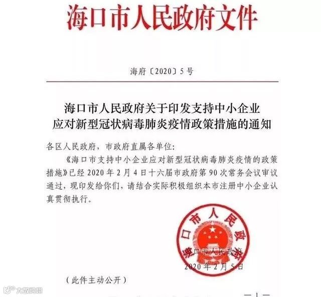 2020年2月4日晚,海口市审议并原则通《海口市人民政府关于支持中小企业应对新型冠状病毒肺炎疫情的政策措施》,支持中小企业共渡难关: