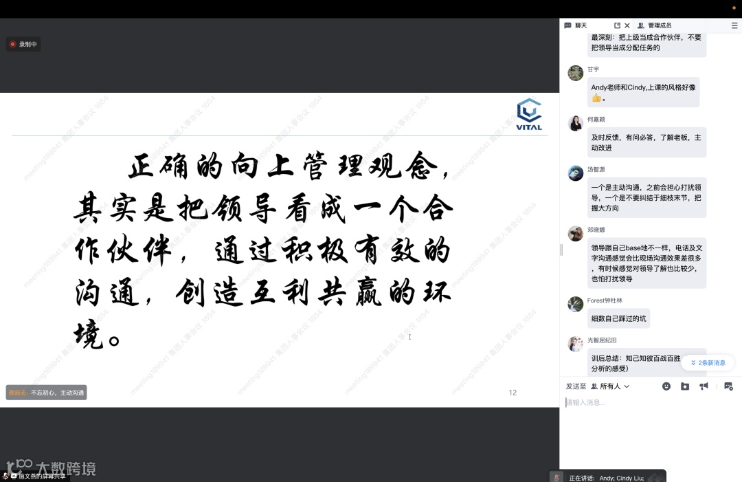 特邀集团人资负责人施文燕女士为学员们讲解《如何让向上管理变得高效简单》课程,内容包含向上管理的合作障碍、向上管理的三大法宝,课程干货满满,学员们纷纷在公屏上分享上课心得。