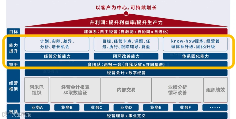 在阿米巴活动中的业绩分析,指的是对《经营会计报表》所统计的各类经营数据的增减变化进行分析,从而得到影响业绩的因素,并持续不断的改善,促进业绩的增长和组织能力的提升。