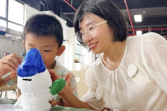 在爸爸妈妈的帮助下,调颜料、勾轮廓、涂色彩,每个环节都神情专注,描绘着自己的作品,不时传出欢声笑语,经过小朋友和爸爸妈妈的齐心协力,一个个石膏娃娃披上绚丽的衣裳。