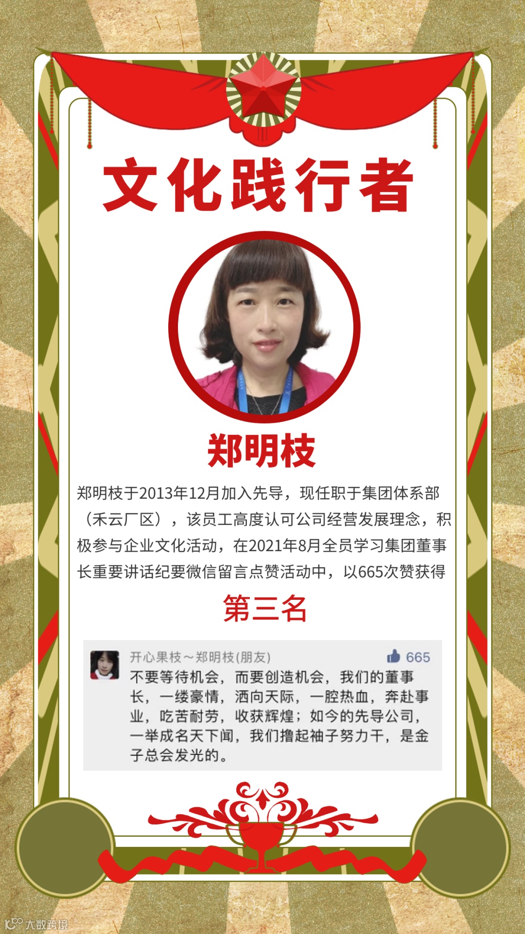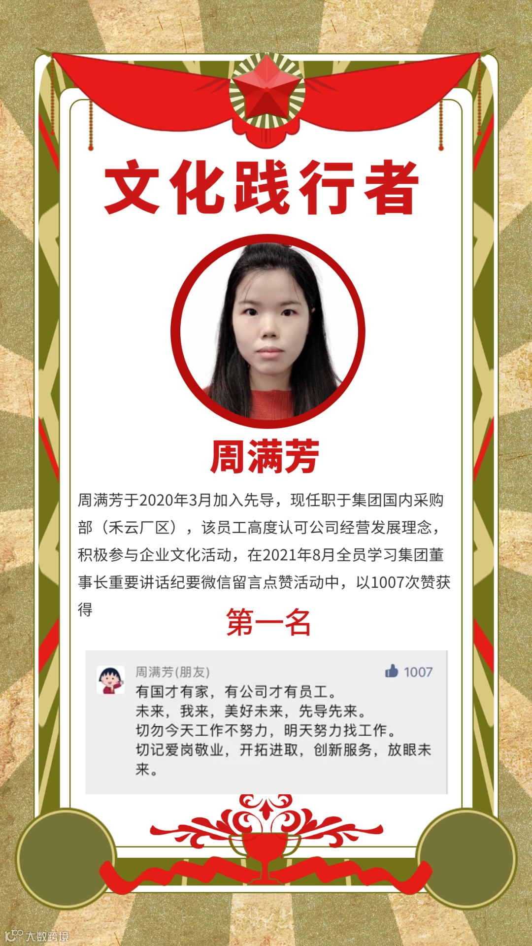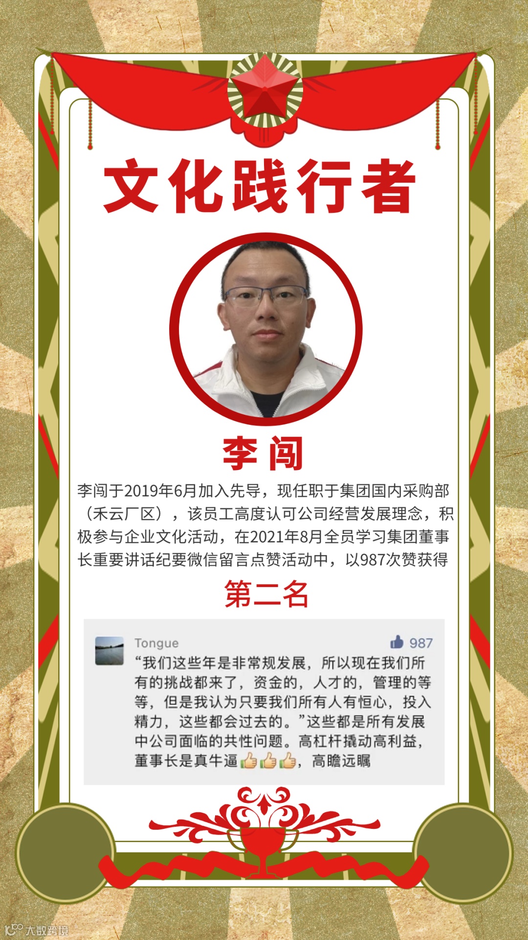再次祝贺以上点赞数量前三名的获奖者!值得一提的是这三位获奖者均来自禾云厂区——先导集团的革命根据地,经过岁月的沉淀,禾云厂区已形成了一套属于先导特有的企业文化,激情、正直、团队协作、长期主义、艰苦奋斗、可持续发展,这些文化特征在禾云厂区充分展现,同时,获奖者这种对企业文化高度认同的精神值得全体员工学习!