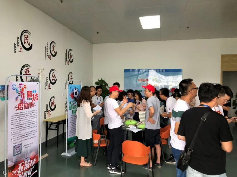 9点整,我们从科技世界回归到现实,集团各个俱乐部在先导大学一楼设摊招新,让大学生新同事们瞬间重温校园社团招新文化。