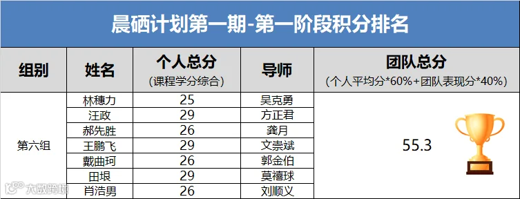 由组长王鹏飞带领的第六组,组员为:汪政、郝先胜、戴曲珂、田垠、肖浩男,他们共同斩获了团队的最高分,成为第一阶段优秀小组。