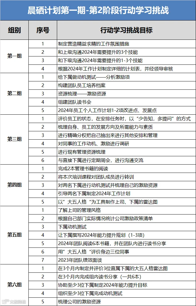 以下为第二阶段每个小组的行动学习挑战目标,后续每个学员按自己工作情况拆分。