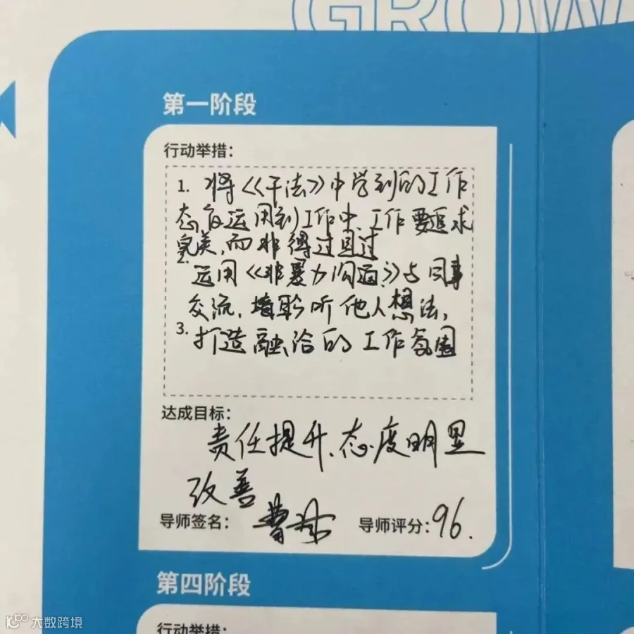 每一个阶段,学员都需要根据当下所学设定挑战任务。在第一阶段培养当中,我们学习了《大五人格自我觉察》、《非暴力沟通》、《干法》,学员根据以上内容,走出舒适圈,改变自己。