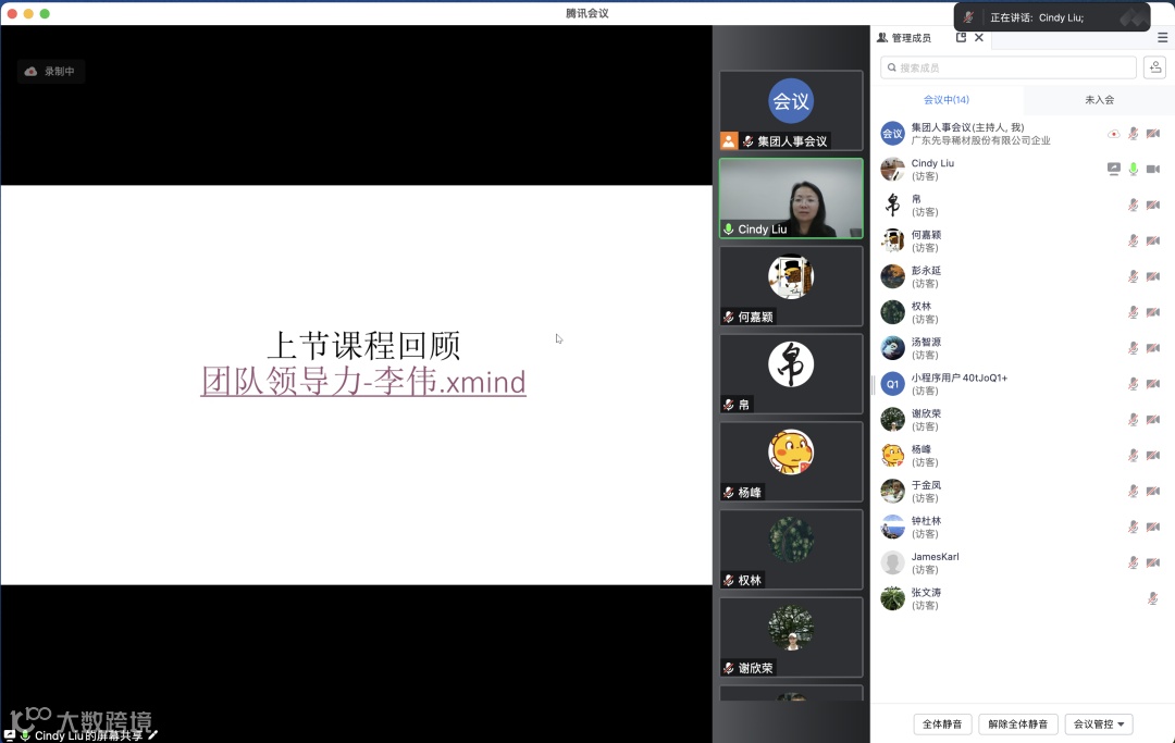 未铼计划第二季度(第2次线上)学习于6月13日进行,集团COE负责人-学员教练Cindy老师针对上一次线下学习内容进行了回顾,各学员针对上次学习内容在工作中的实践情况或问题进行了分享,针对大家的分享Cindy老师也做了一一反馈,最后教练分享了《跨越式领导力》内容。