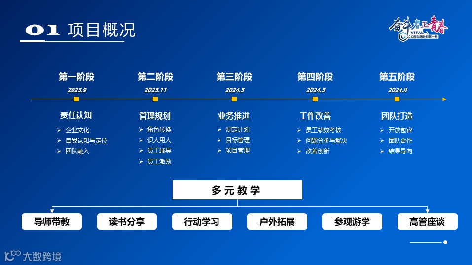 本次培训规划基于咨询机构专业测评及主管能力模型相结合,聚焦提升青年人才的责任认知、管理规划、业务推进、工作改善、团队打造五项能力。通过为期一年的培养,使学员能够至少具备胜任主管岗位的100%能力,当对应岗位空缺时,能够胜任并高产出,能够带领团队创造高业绩。