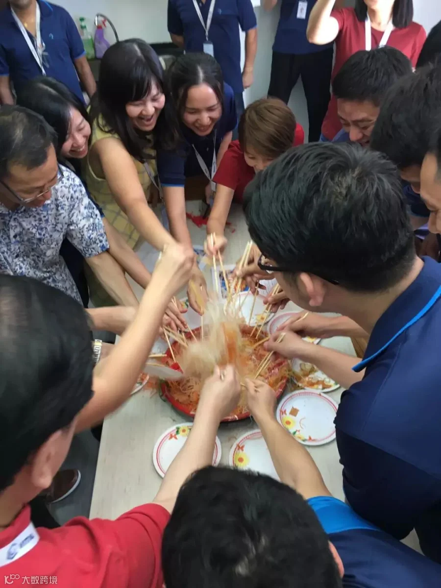 年初七,亦传统习俗的人日,公司组织了“捞鱼生”,这是新马一带华人特有的庆祝春节的方式,也是一道吉祥的菜式,寓意来年有好运发大财!捞鱼生是将生鱼条搭配腌姜丝及各种有颜色的蔬菜丝及水果丝等,预先排列在一个大圆盘上,洒上白芝麻、花生碎、五香粉及胡椒粉等,然后一个人发号施令,大家就开始用筷子将大圆盘中的各式材料高高的夹起,一边夹高一边说:捞起!捞起!捞到风生水起,一年好过一年!据说把鱼生盘中的材料夹得愈高,来年就会赚得越多!最后大家再一起共进午餐,吃掉鱼生。