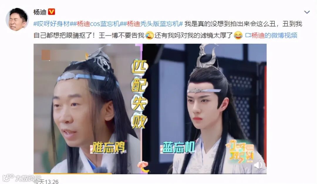 近日,杨迪在《哎呀好身材》节目中扮演起秃头版蓝忘机而上热搜,网友纷纷表示画面太美不敢直视,笑趴了。杨迪本人也发微博称自己丑到想把眼睛抠下来,求王一博别告他。
