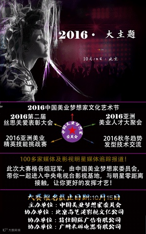 中国美业梦想家文化艺术节将于2016年10月18号在北京隆重举行,期间100多家媒体及影视明星媒体会追踪报道!中国美业梦想家委员会将会带领此次大赛各组冠军一起进入中央电视台影视基地,与明星零距离接触,让你更好的发挥才艺。更诱惑的是全场总冠军选手可获得参加中国美业梦想家2017年大秀一次。
