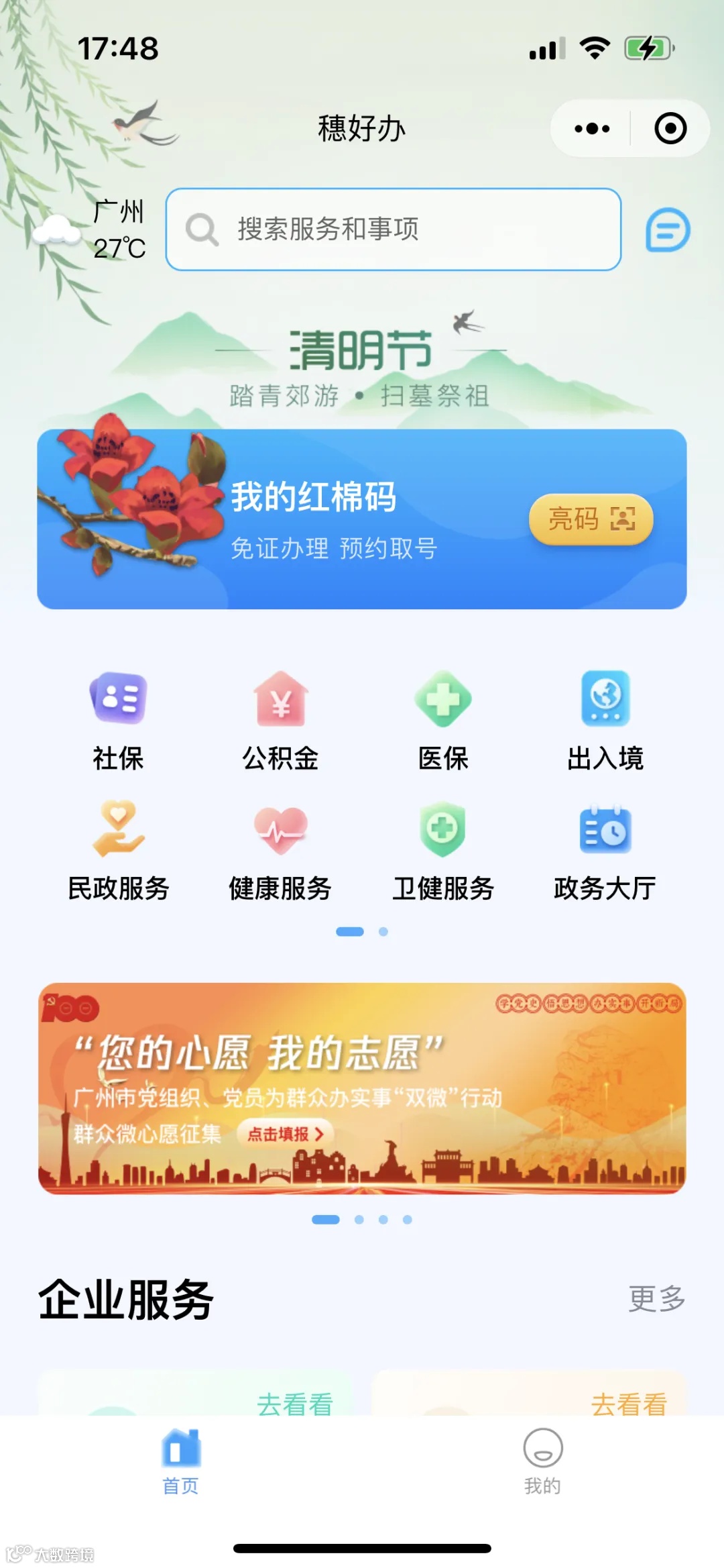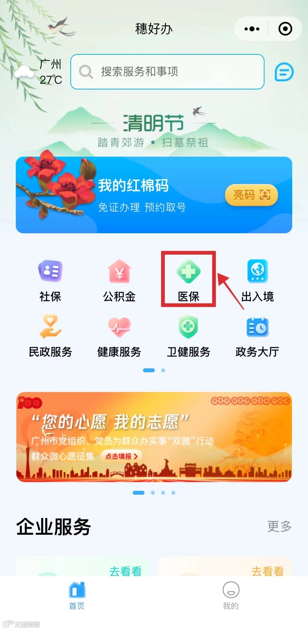 1.登录“穗好办”小程序或APP并实名认证,进去主界面后,点击“医保”,进入医保服务区。