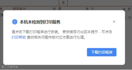 打印发票时系统提示:“本机检测到打印服务非最新版本”或“本机未检测到打印服务”,请点击右下角按钮下载最新程序。