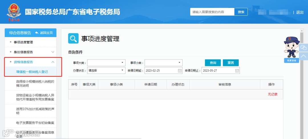 3.点击【资格信息报告】-【增值税一般纳税人登记】,点击【办理】进入一般纳税人登记界面