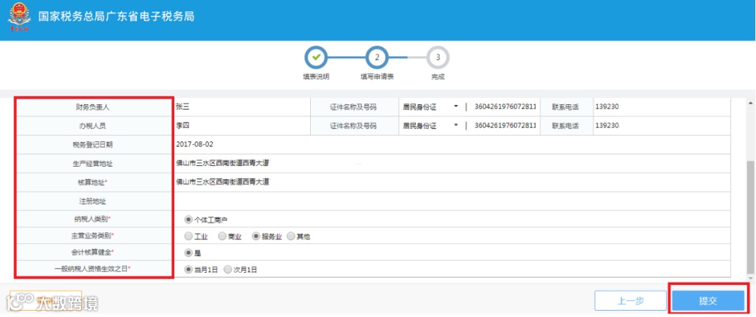 4.阅读填表说明后点击【确认】-【下一步】,填写《增值税一般纳税人登记表》,信息确认无误后点击【提交】
