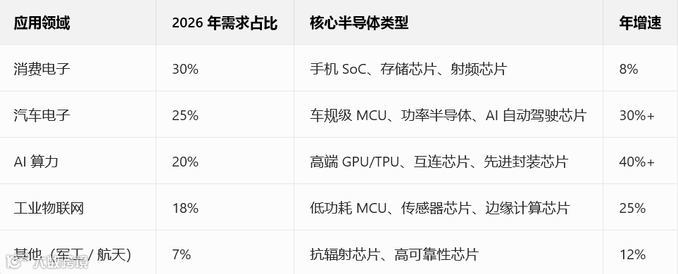 2026年,半导体下游需求结构已彻底改写:汽车电子、AI算力占比合计达45%,超越传统消费电子成为增长主力。