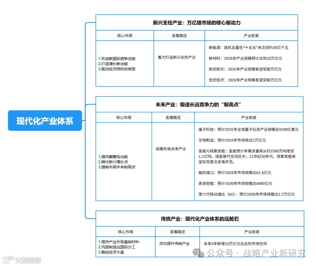 《建议》中,现代化产业体系主要由三部分构成:一是推动传统产业提质升级;二是着力打造新兴支柱产业;三是前瞻布局未来产业。