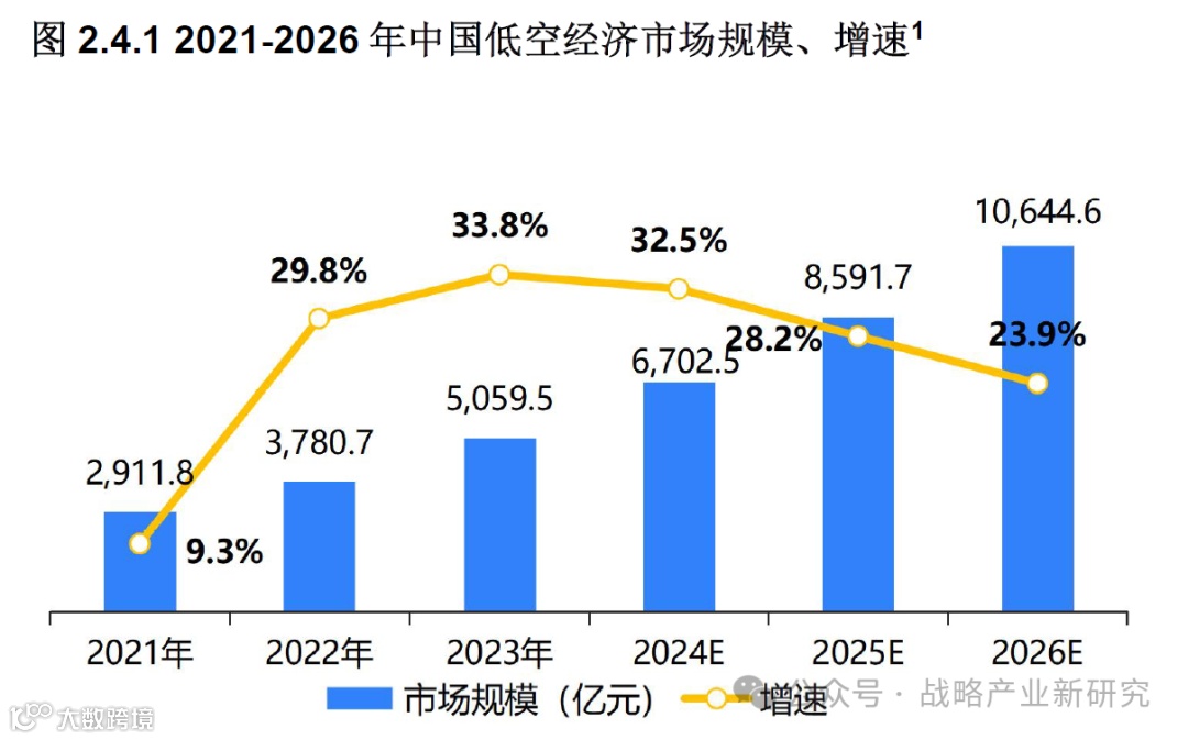 在空域管理改革等政策推动下,中国低空经济正从试点探索走向规范化发展。根据赛迪顾问数据,2023 年我国低空经济规模达5059.5 亿元,同比高增33.8%;