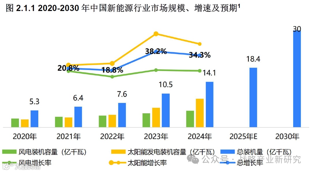 我国新能源装机规模持续保持全球领先。截至2024 年底,累计装机容量达14.1 亿千瓦,风电、光伏装机量均居世界第一,并已提前完成2030 年装机目标。全年新增装机中,新能源占比达83%,成为新增电源主体。据预测,“十五五”期间年新增装机将维持在3 亿千瓦左右。