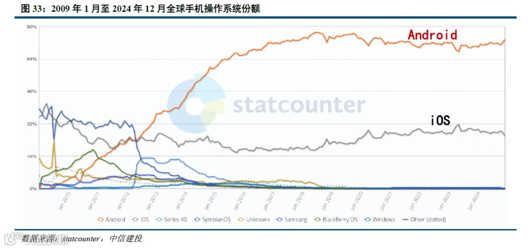 iOS:同样在安卓系统正式发布的2007年,苹果发布了搭载iOS系统的第一代iPhone,开启了智能手机的新时代。相较于安卓的开放,苹果iOS系统采用封闭式生态,严格把控软件审核环节,一定程度限制了系统的灵活性,但为用户提供了一致且高质量的使用体验。从市场份额看,近年来iOS系统的市占率相对稳定,2024年12月市场份额为26.04%,低于2009年1月iOS的市场份额35.56%。