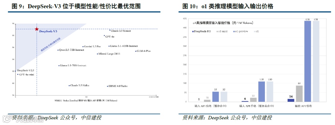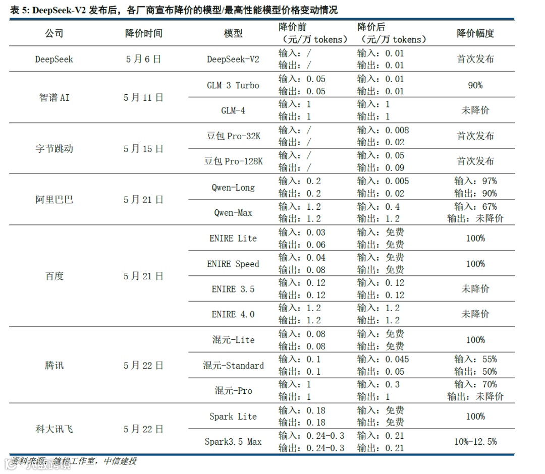 应用:DeepSeek-V3/R1作为通用/推理方面的基础模型,性能升级及在各类 Benchmark 跑分中的提高,本身就为应用落地带来了更大的可能性。然而,对于开发者而言,更关键的点在于模型能够和应用适配调优,提供稳定性的API服务,以及性价比更高的tokens成本。参考2024年5月DeepSeek-V2发布后带来的大模型价格战,即使模型成本更高,字节、阿里等大厂亦按照烧钱补贴的逻辑大幅降价,本质上是因为开发者价格敏感,大厂愿意亏钱抢占市场份额,培育开发者使用习惯。