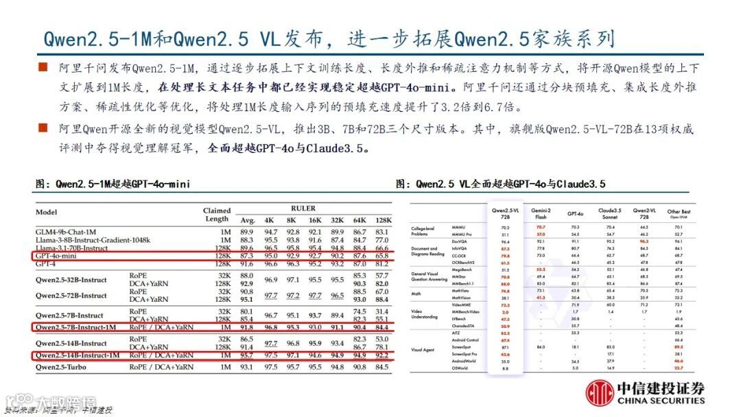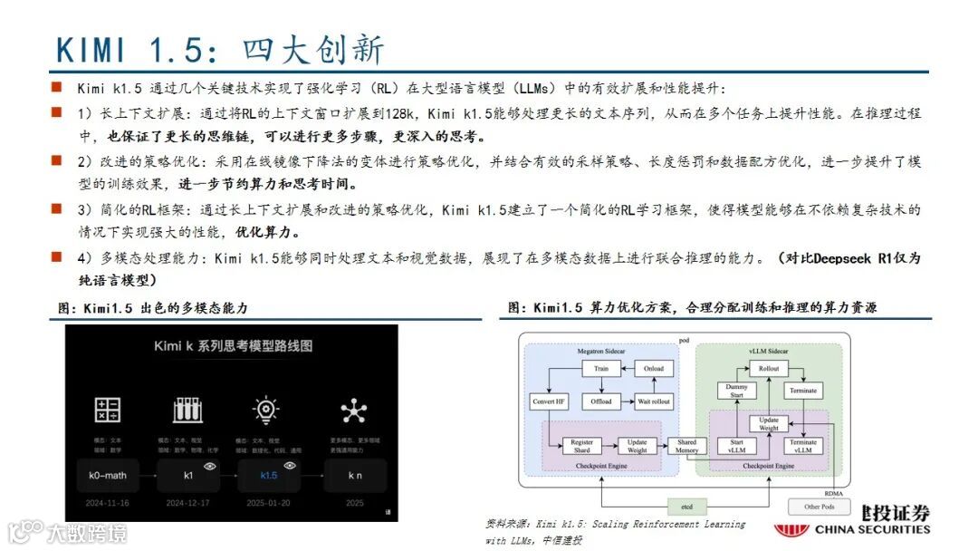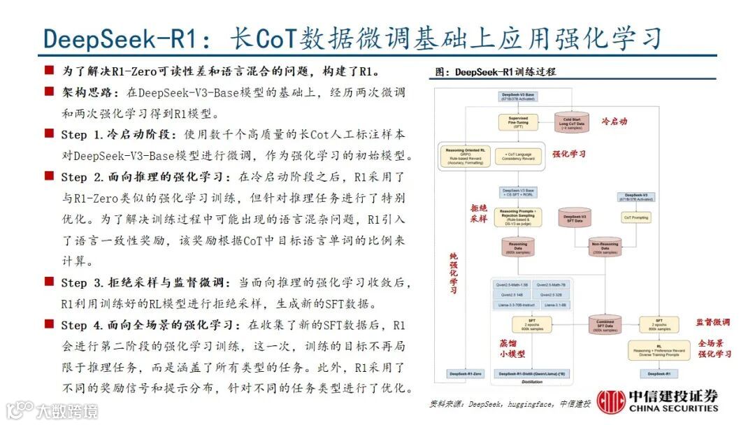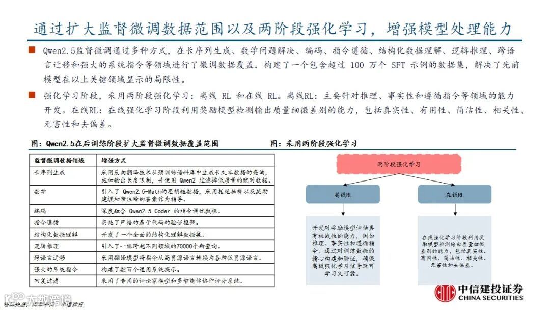 我们认为,Scaling Law仍有效,同时RL技术的不断迭代为模型能力的规模化扩张带来了新的方向。特别是DeepSeek通过架构和技术创新,提出了纯RL和分阶段的模型训练方法,并实现了较好的性能表现。预计各厂商将陆续跟进DeepSeek的算法方向,并不断对架构进行调整,以探索出更为理想的模型优化方式。