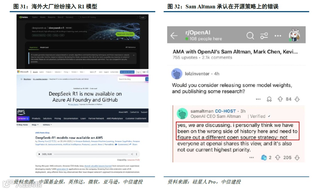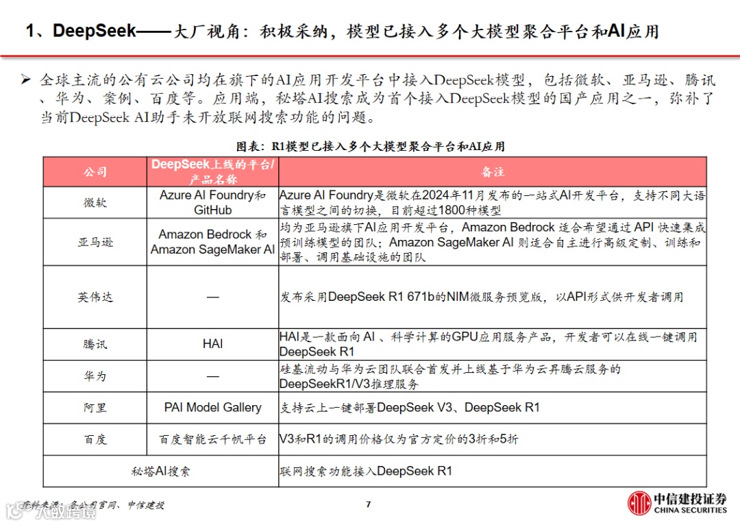 全球大厂接连接入R1,DeepSeek冲击下OpenAI战略方向或将转向。尽管美国质疑DeepSeek在安全性、隐私方面的问题,但英伟达、英特尔、亚马逊、微软、AMD等海外巨头仍纷纷在自家产品中接入了DeepSeek;国内硅基流动和华为云同样联合首发并上线了基于华为云昇腾云服务的DeepSeek R1/V3推理服务。受DeepSeek全球热度冲击,Sam Altman承认在开源策略上“站在了历史错误的一边”,并表示正在讨论开源部分模型。此外,OpenAI于2月1日紧急更新了o3-mini系列,即使是免费用户也可以通过选择“Search+Reason”来使用体验o3-mini的搜索功能。然而,o3-mini模型当前的定价为每百万输入 tokens 0.55美元(缓存命中)/ 1.1美元(缓存未命中),每百万输出 tokens 4.4美元,远高于R1模型。