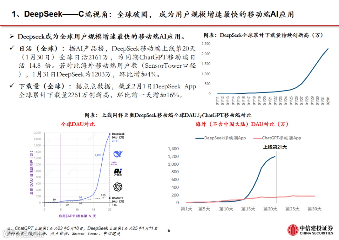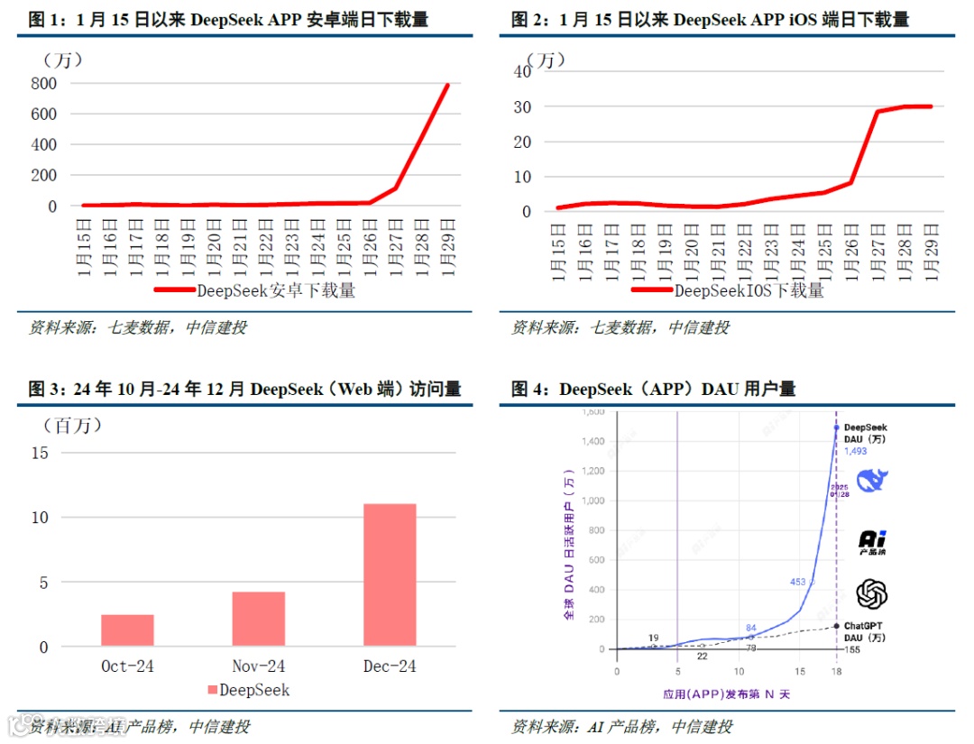 我们认为,DeepSeek用户数将持续高速增长。一方面DeepSeek作为开源路线的坚定践行者,有望受到全球开发者的高度关注;另一方面受益于春节期间信息传播下沉,DeepSeek的国内渗透率将持续提升。